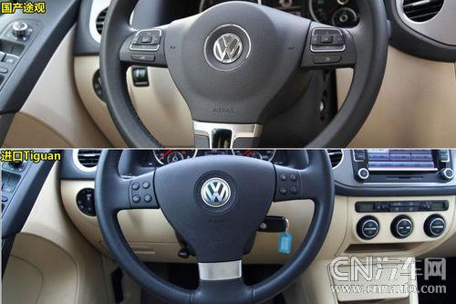 內(nèi)飾及細(xì)節(jié)差異:國產(chǎn)車型在一些細(xì)節(jié)設(shè)計上要更具優(yōu)勢,比如方向盤采用了高爾夫6式的新風(fēng)格,方向盤輻條和多功能按鍵在金屬鍍鉻的裝飾下,明顯更具質(zhì)感。此外,包括大燈調(diào)節(jié)旋鈕、電動車窗按鈕都增加了金屬風(fēng)格的裝飾。雙區(qū)自動恒溫空調(diào)也啟用了和斯柯達(dá)昊銳相同款式的最新設(shè)計面板。而在一些并不是十分重要的配置上,國產(chǎn)車型省略后以進(jìn)一步降低價格,比如音響面板上方的副駕駛席氣囊指示燈變成了卡片槽,手套箱中的副氣囊開關(guān)也沒有再出現(xiàn)。國產(chǎn)車型由于兩種排量多達(dá)8款車型配置,導(dǎo)航系統(tǒng)、全景天窗都可以選裝配置也讓消費(fèi)者多了更多選擇。尤其是對于低端消費(fèi)者,國產(chǎn)途觀還是具備相當(dāng)?shù)奈Α?/p>