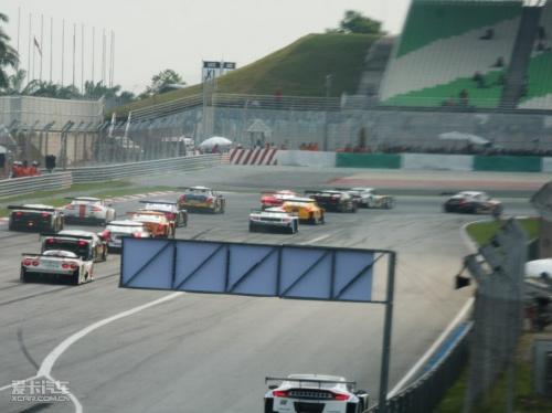 GT300、GT500兩組賽車同時發(fā)車,1號彎競爭非常激烈↑