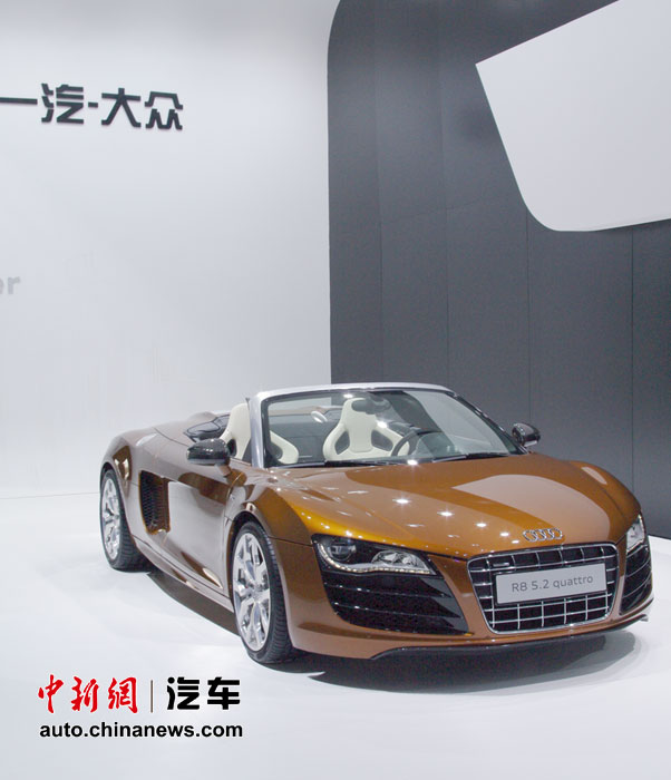 在人流如織的海外汽車巨頭的展館里,天價豪車成了當仁不讓的最搶眼明星,相形之下即使再靚麗的車模也黯然失色。圖為奧迪 R8 5.2 Quattro