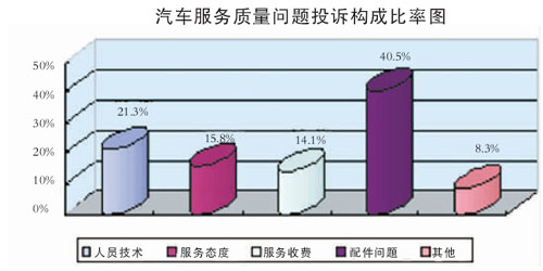 2007年三季度,全國汽車售后服務(wù)質(zhì)量投訴表明,服務(wù)收費(fèi)、服務(wù)態(tài)度和配件供應(yīng)在服務(wù)質(zhì)量投訴中占到70%以上。