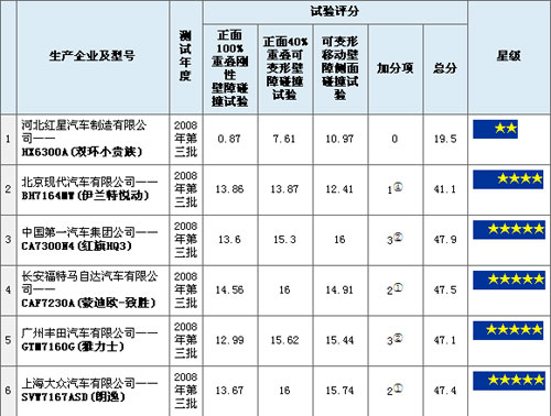 獲得五星級(jí)碰撞成績(jī)的車型還有:長(zhǎng)安福特馬自達(dá)汽車有限公司生產(chǎn)的蒙迪歐牌CAF7230A型轎車(蒙迪歐致勝)、廣州豐田汽車有限公司生產(chǎn)的豐田牌TOYOTA GTM7160G型轎車(豐田雅力士)、上海大眾汽車有限公司生產(chǎn)的朗逸牌LAVIDA SVW7167ASD型轎車。北京現(xiàn)代汽車有限公司生產(chǎn)的北京現(xiàn)代牌BH7164MW型轎車(悅動(dòng))獲得四星級(jí)成績(jī)。河北紅星汽車制造有限公司生產(chǎn)的紅星牌HX6300A型旅行車(雙環(huán)小貴族)僅獲兩星級(jí)成績(jī)。