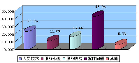 報告顯示,在汽車產(chǎn)品服務質量的投訴中,對配件問題、服務態(tài)度的投訴較上一季度有所增加,對人員技術、服務收費的投訴有所下降。其中,久修不好是引發(fā)消費者投訴廠家服務質量的最主要原因。具體構成比例:人員技術占23.5%,服務態(tài)度占11.0%,服務收費占16.4%,配件問題占43.2%,其他占5.9%。