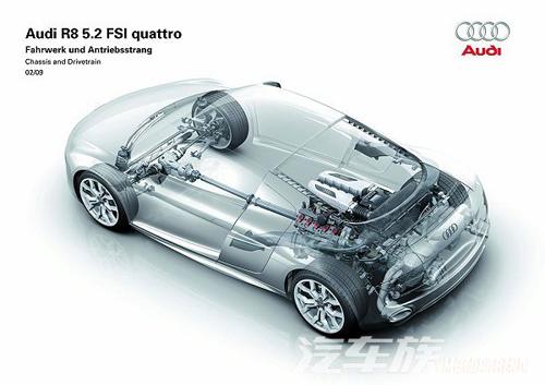 一如先前所介紹的般,R8 5.2 FSI quattro搭載著5.2L V10汽油引擎,使用了缸內(nèi)直噴、干式油底殼、12.5:1壓縮彼等設計之后,最大馬力可達到525hp/8000rpm,且轉(zhuǎn)速極限設在8700rpm,峰值扭力也高達54.1kgm/6500rpm,平均容積比可達到100.9hp/L的輸出,展現(xiàn)出此具自然進氣汽油引擎的能耐,最令人驚奇的是,由于諸多先進科技的導入,R8 5.2 FSI quattro還可擁有7.3km/L的平均油耗,對于一款性能至上的超跑而論,此般表現(xiàn)已堪稱杰出。