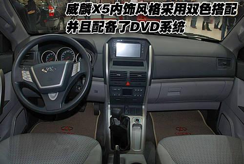 威麟X5不僅外觀非常兇悍,內(nèi)飾的風(fēng)格同樣比較硬朗。在內(nèi)飾顏色布局方面,這款車(chē)采用雙色調(diào)設(shè)計(jì),整車(chē)的內(nèi)部機(jī)構(gòu)設(shè)計(jì)都與奇瑞其他車(chē)型有不同的感覺(jué)。