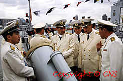 在上海訪問的俄羅斯海軍艦艇編隊官兵,十月四日在中國海軍揚子江碼頭參觀中國新型的海軍導彈驅(qū)逐艦和護衛(wèi)艦。