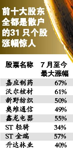 權威統(tǒng)計數(shù)據(jù)顯示,能夠在A股上市公司前十大流通股股東中“露臉”的個人投資者超過5000人。從中報來看,31只股票的前十大股東都是個人投資者,并且在7月份以來其整體表現(xiàn)十分出色,漲幅超過20%的就達22只。
