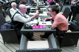 昨晚5時(shí),民族園快捷假日酒店一層大廳,兩組長(zhǎng)條餐桌擺放在現(xiàn)場(chǎng)的正中央!鞍头铺亍焙汀吧w茨”的名牌赫然擺放在兩排桌子的頭位,但位子一直空著。此前平民晚宴通過(guò)媒體向兩人發(fā)出邀請(qǐng)。其余座位都已坐滿,不斷有人簽到,只得在長(zhǎng)桌的一側(cè)加座位。近100人參加平民晚宴,涉及公司白領(lǐng)、企業(yè)老板、大學(xué)生、公務(wù)員、醫(yī)生等各行業(yè)。