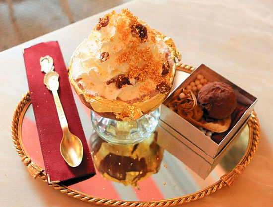 這家店出售的奢侈甜品非同一般,它們的價(jià)格已打破最貴甜品的世界紀(jì)錄。包括價(jià)格約合17萬(wàn)元人民幣的“頂級(jí)金箔巧克力布丁”和價(jià)格約合6800元人民幣的“英格蘭黃金圣代冰激凌”。這兩樣甜點(diǎn)已打破吉尼斯世界記錄,成為全球最昂貴的甜品。