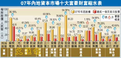 中新網(wǎng)7月28日電 據(jù)香港《文匯報(bào)》報(bào)道,中國(guó)內(nèi)地有媒體27日公布“2007資本市場(chǎng)富豪榜”,以07年A股市場(chǎng)最后一個(gè)交易日收市值計(jì)算,蘇寧電器大股東張近東等10大資本家榜上有名。受惠于2007年內(nèi)地股票市場(chǎng)爆發(fā)式增長(zhǎng),該榜單前十大富豪的財(cái)富最低門(mén)坎已升高至100億元,而2006年邁入前十俱樂(lè)部則只需要30億元。不過(guò),僅僅半年,其中大部分人便“風(fēng)光不再”。隨著內(nèi)地股市半年來(lái)的一路慘跌,他們的身家亦大幅縮水。據(jù)統(tǒng)計(jì),在榜單的前10名富豪中,所持有的股票下跌幅度最高竟達(dá)八成。