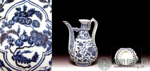 據(jù)云南典藏有關(guān)負(fù)責(zé)人介紹,拍賣(mài)“標(biāo)王”青花開(kāi)光折枝花果紋執(zhí)壺通體施以白釉,釉質(zhì)青白透澈,肥潤(rùn)晶瑩,青花發(fā)色翠藍(lán)深沉,局部有鐵銹斑,圖案為上等“蘇麻離青”鈷料所繪。從文物藝術(shù)品的收藏價(jià)值來(lái)看,執(zhí)壺整器端莊大氣,做工精湛,屬于明代永樂(lè)時(shí)期青花瓷中的代表之作。目前,除國(guó)內(nèi)外的文物館藏之外,同類器物能在國(guó)內(nèi)外市場(chǎng)上流通的可謂屈指可數(shù),很少見(jiàn)諸于市,因此也就更加彌足珍貴了。