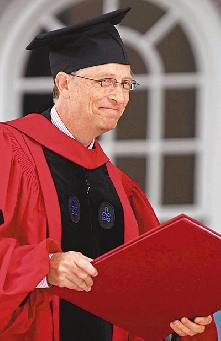 哈佛大學(xué)學(xué)生報(bào)《哈佛深紅報(bào)》將蓋茨稱為“哈佛最成功的輟學(xué)生”,他在1973年秋季入讀哈佛,兩年后輟學(xué),和兒時(shí)玩伴艾倫一同創(chuàng)辦了微軟公司。在離開哈佛30多年后的2007年,蓋茨終獲得母校授予榮譽(yù)博士學(xué)位。