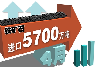 海關12日公布的數(shù)據(jù)顯示,4月份,我國鐵礦石進口5700萬噸,創(chuàng)造了歷史新高。我國鐵礦石進口自1月以來連續(xù)4個月攀升,1-4月份合計進口鐵礦石18846萬噸,累計增長22.9%。