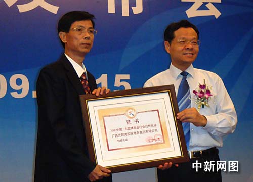 發(fā)布會上,中共廣西壯族自治區(qū)委員會常委、自治區(qū)副主席陳武為中國銀行廣西分行、廣西中煙、廣西北部灣國際港務(wù)集團有限公司、上海通用汽車有限公司等此次與中國—東盟博覽會簽署合作伙伴協(xié)議的38家企業(yè)頒發(fā)證書,表明雙方合作的極大誠意。