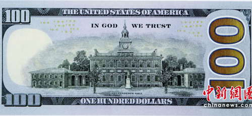 美國財政部公布了新版100元美鈔的照片,鈔票上同樣仍是美國開國元老之一的富蘭克林(Benjamin Franklin)肖像,但鈔票正中央多了一道藍色的3D立體安全圖樣,隨著角度不同,可以變換鐘或數字100的圖型。