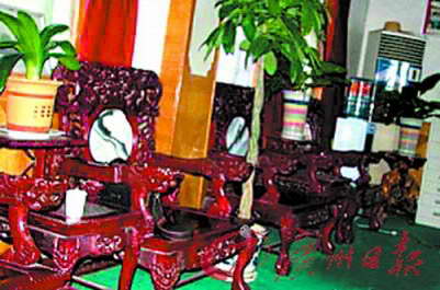 最令人瞠目的是“書記室”里的擺設(shè)。偌大的房間里,擺滿了散發(fā)著古樸香氣的名貴紅木椅子、茶幾。光紅木椅子就有14張。鄰近鄉(xiāng)鎮(zhèn)一位來訪的領(lǐng)導(dǎo)告訴記者,每張椅子的價錢都不會低于5萬元。更令人稱奇的是,黨委書記本人坐的是椅背上雕有龍圖案的“龍椅”。知情人告訴記者,光是書記室內(nèi)的老板桌、龍椅、紅木家具等擺設(shè),價值應(yīng)該在百萬元以上。