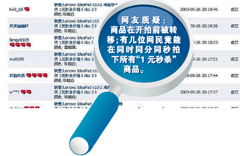 淘寶的安民公告,仍然為部分網(wǎng)友所不能接受。天涯網(wǎng)友“秋風(fēng)月無痕”認(rèn)為,淘寶沒出面解釋何以有三人能在同一分同一秒同時秒下三件商品!皟(nèi)有種種怪異之事,不得不讓人想到這是一場欺騙廣大中國人民的炒作行為。如果淘寶不能給出合理的讓人信服的解釋,那么最終受害的不單單是廣大受騙的群眾,更是淘寶網(wǎng)! “秋風(fēng)月無痕”及幾名網(wǎng)友隨后在跟帖中貼出當(dāng)晚截圖,聲稱既然當(dāng)晚人太多,“不能正常瀏覽頁面”,而實際上商品已經(jīng)在20時03分之前下架,但網(wǎng)友卻截圖發(fā)現(xiàn)有多條20時17分到20時19分的記錄,“淘寶怎么解釋這幾條記錄,03分到17分之間是空的,但是17分到19分之間突然冒出幾條記錄,這能讓人不懷疑是做了手腳嗎?”