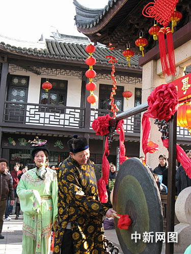 隨著一聲洪亮的鑼響,周莊莊主朗聲宣布“開莊了!”頓時,爆竹脆耳,鑼鼓震天。在丫鬟、家丁的簇?fù)硐隆吧蛉f三”手捧元寶開始向眾人贈財送福,并一路引著八方來客入莊巡游。大街小巷,隨處可見身穿水鄉(xiāng)服飾的周莊婆婆忘情地挑花籃、打連廂、蕩湖船,用古鎮(zhèn)最傳統(tǒng)的方式迎接元旦佳節(jié)。古老而傳統(tǒng)的開莊儀式也拉開了古鎮(zhèn)新的一年里傳統(tǒng)節(jié)慶系列民俗活動的序幕。