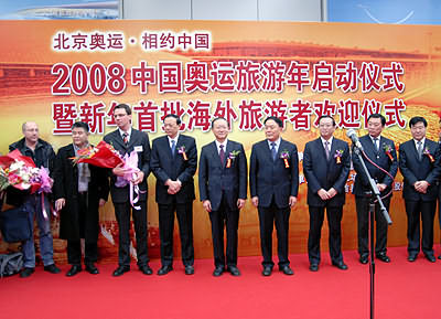 中新網(wǎng)1月2日電 據(jù)國家旅游局網(wǎng)站消息,2008年元月一日上午10:50分,CA932航班平穩(wěn)地降落在北京首都國際機(jī)場。飛機(jī)艙門打開時,德國伊卡魯斯旅行社副總裁萊爾夫·琥珀先生接到了來自北京市旅游局工作人員送上的鮮花。他所率領(lǐng)的德國234名游客成為2008年北京入境的第一批旅游者。這標(biāo)志著2008年中國奧運(yùn)旅游年正式啟動。