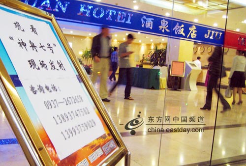 在酒泉某四星級賓館的大門前,一張告示牌赫然醒目:觀看“神州七號”現(xiàn)場發(fā)射。記者按圖索驥找到這家旅行社,接待人員黃小姐說,他們確在組織9月25日觀看“神七”發(fā)射的旅行團,當日往返每人收費1000元,目前已有十幾個人報名。