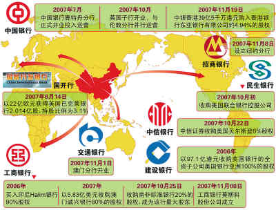 繼建行、中行和工行之后,交通銀行、民生銀行分別表示將在今年邁出海外并購的步伐。加上去年10月,我國金融企業(yè)進(jìn)行的最大一筆海外收購——工行以55億美元的價(jià)格收購南非標(biāo)準(zhǔn)銀行20%股份,我國國有銀行進(jìn)軍國際市場已開足馬力。