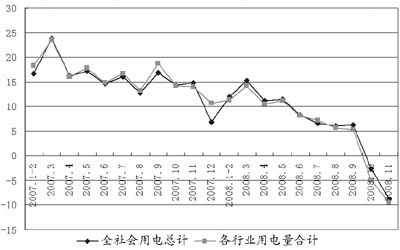 由國(guó)網(wǎng)北京經(jīng)濟(jì)技術(shù)研究院副院長(zhǎng)胡兆光博士繪制的一份“2007年以來各月我國(guó)全國(guó)及各行業(yè)用電量增長(zhǎng)速度”圖表(圖1)顯示:全國(guó)月度用電量增長(zhǎng)率在2007年3月曾高達(dá)23.88%,全行業(yè)(一、二、三產(chǎn))月度用電量增長(zhǎng)率也達(dá)到23.48%。此后便呈起伏式下滑,全國(guó)用電量10月份同比增長(zhǎng)-2.18%,11月份同比增長(zhǎng)-8.33%。