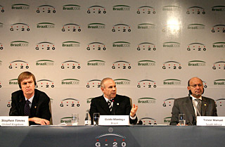 二十國集團(tuán)財(cái)政部長和中央銀行行長(G20)2008年年會9日在巴西圣保羅閉幕,與會代表一致認(rèn)為有必要改革目前的國際金融體系,采取共同行動應(yīng)對全球金融危機(jī)。