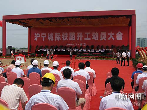 今天的動(dòng)員大會(huì)上,中共上海市市委書記俞正聲,鐵道部部長(zhǎng)劉志軍、江蘇省委書記梁保華、省長(zhǎng)羅志軍等官員出席,為滬寧城際鐵路開工鏟土奠基。