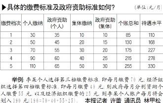 最低的個人繳費標準確定為30元,以20元為級差,向上設(shè)立五個檔次的繳費標準,最高一檔為110元。參保農(nóng)民可根據(jù)各自的經(jīng)濟承受能力自愿選擇一檔繳費,多繳多得!掇k法》對經(jīng)濟組織設(shè)計了5個檔次的繳費標準,從10元至50元不等;對于確無經(jīng)濟能力的經(jīng)濟組織,也可以暫不為參保人繳費。