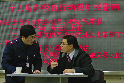 稅務(wù)工作人員指導(dǎo)納稅人填寫申報(bào)資料記者 陳誠(chéng) 攝