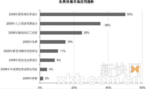 美世報告覆蓋了汽車、高科技、化工、消費品、機械及電子、醫(yī)藥和醫(yī)療器械、能源、保險、房地產等行業(yè)308家國內外知名企業(yè)。參與調研的企業(yè)中,75%的企業(yè)表示不會采取降薪,2%的企業(yè)表示會采取降薪。但是,50%的公司表明將會調低2009年的薪資增長率,調低薪資增長率是目前被最多企業(yè)所采取的應對經濟危機的措施。