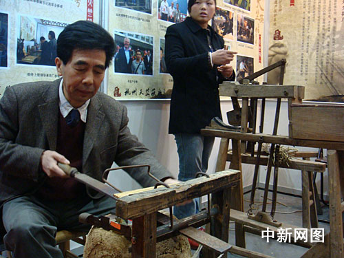杭州一家主營(yíng)筷子的企業(yè)正在現(xiàn)場(chǎng)展示傳統(tǒng)制筷工藝。姜越潮 攝