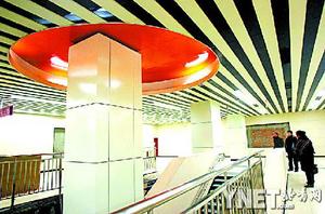 “太空艙”———這是記者對(duì)“金臺(tái)夕照”站廳裝修的直接印象。寬闊站廳內(nèi),兩側(cè)墻壁如括號(hào)般向內(nèi)彎曲形成類(lèi)似機(jī)艙的形狀。除了地面之外,無(wú)論墻壁還是天花板,圓形白光燈池和橘紅色色塊如密集的氣泡一樣分布,大的直徑可達(dá)1米,小的直徑才20厘米左右。面對(duì)如此現(xiàn)代風(fēng)格的設(shè)計(jì),“金臺(tái)夕照”仿佛被賦予了新的生命。