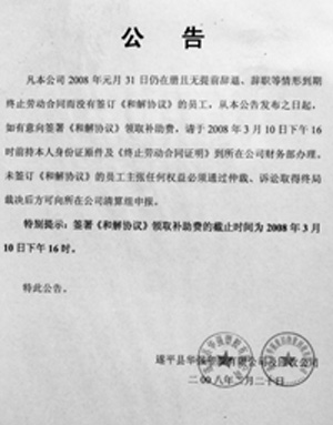 此后,遂平華強門口又張貼出公告,特別提示簽署《和解協(xié)議》領(lǐng)取補助費的截止時間為2008年3月10日。
