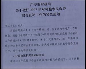 鄧永學(xué)說的每畝補(bǔ)貼25元,指的是2006年的種糧補(bǔ)貼標(biāo)準(zhǔn),根據(jù)記者了解,在武勝縣,2006年對于農(nóng)戶種植一畝糧食直補(bǔ)和綜合補(bǔ)貼總計25.12元,而在2007年,每畝補(bǔ)貼提高到了51.05元,國家的種糧補(bǔ)貼額度提高了一倍,然而,在當(dāng)?shù),國家對種糧補(bǔ)貼的提高速度趕不上生產(chǎn)成本的漲價速度。