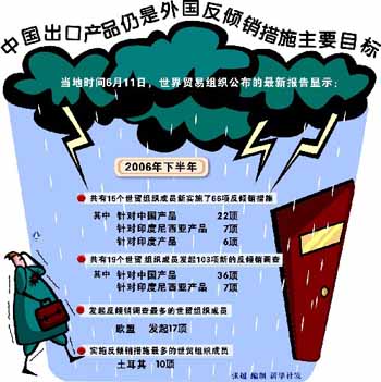 世貿(mào)組織早前發(fā)布的反傾銷統(tǒng)計(jì)報(bào)告顯示,從1995年至2006年,中國(guó)已連續(xù)12年成為世界上遭受反傾銷調(diào)查和被實(shí)施反傾銷措施數(shù)量最多的國(guó)家,2007年全球新立案的反傾銷調(diào)查雖呈下降趨勢(shì),但中國(guó)仍然是全球反傾銷調(diào)查的頭號(hào)目標(biāo)國(guó)。