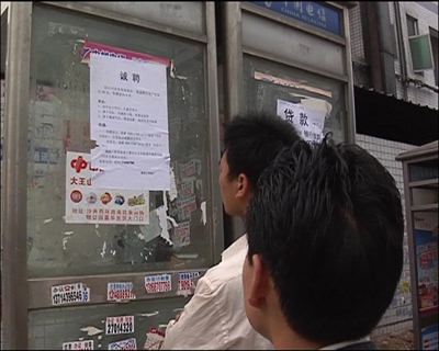這就是他們倆頭一天交錢的地方,如今已是人去樓空,李美銳和肖方云白白損失了20塊錢,不過最終在記者的建議下,兩人還是在幾經(jīng)打聽后,來到了附近的一個勞動力市場,這是個很正規(guī)的中介機構(gòu),但在市場轉(zhuǎn)了一會后,兩人又碰到了一個難題。