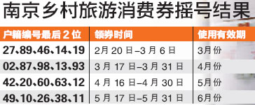 此次發(fā)放活動(dòng)的旅游券消費(fèi)時(shí)間為3月-6月,不過(guò)鄉(xiāng)村旅游消費(fèi)券標(biāo)有使用月份,按月使用,有效期為當(dāng)月。本次搖號(hào)方式,根據(jù)江南八區(qū)居民戶口簿編號(hào)的最后兩位數(shù)字進(jìn)行搖號(hào),分別搖出3、4、5、6月份鄉(xiāng)村旅游消費(fèi)券的發(fā)放戶口簿號(hào)碼,每個(gè)月為一組,每組為5個(gè)號(hào)碼。