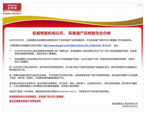 對于報道中介紹的那些患兒,我深表關(guān)切,我們理解父母們擔(dān)憂的心情。但迄今沒有醫(yī)學(xué)報告可以證明任何多美滋產(chǎn)品與這些病癥的關(guān)聯(lián)性。我想再次向我們的員工申明,多美滋在國內(nèi)生產(chǎn)銷售的奶粉全部符合中國相關(guān)標(biāo)準(zhǔn)。所有批次的產(chǎn)品都經(jīng)過了官方認(rèn)證的實(shí)驗(yàn)室的檢驗(yàn),被確認(rèn)不含三聚氰胺。同時,質(zhì)檢系統(tǒng)駐廠人員還在對我們(當(dāng)然還有其它所有的乳品品牌)的生產(chǎn)和產(chǎn)品質(zhì)量進(jìn)行不間斷的監(jiān)督。
