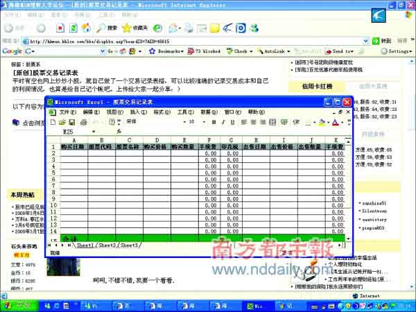 這張受到熱烈追捧的帖子,發(fā)表在某著名理財網(wǎng)站股票頻道。帖子中網(wǎng)友“WYI520”稱自己因為偶爾也上網(wǎng)炒股,為了使得自己的交易狀況、成本等一目了然,特意制作了一個簡單的電子賬簿,并上傳在網(wǎng)站上和大家一起分享。記者下載這份“賬簿”后發(fā)現(xiàn),它僅僅是一個最為簡單的EXCEL表格,共分為15項內(nèi)容,包括購入的股票代碼、名稱,購入價格、數(shù)量,手續(xù)費印花稅,賣出的時間、數(shù)量、價格,最終的利潤等等,總之,股票交易整個環(huán)節(jié)中的主要參數(shù)都是這份小賬簿記錄的內(nèi)容。