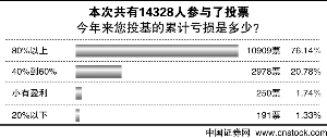 上周,中國(guó)證券網(wǎng)進(jìn)行了“今年來您投基累計(jì)虧損為多少”的調(diào)查,獲得了投資者廣泛關(guān)注,共有14328人參與了投票。結(jié)果顯示,有10909名投資者損失達(dá)到了80%以上,達(dá)到全體投票者總數(shù)的76.14%。選擇虧損在40%-60%的基民人數(shù)為2978,占投票者總數(shù)的20.78%。191名投資者損失低于20%,占投票者總數(shù)的1.33%。只有250名基民表示,今年以來小有盈利,僅占全部投票者的1.74%。