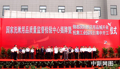 中新網(wǎng)邗江五月十八日電(記者 崔佳明 馬春陽(yáng))五月十八日,江蘇邗江在杭集鎮(zhèn)舉行國(guó)家洗漱用品質(zhì)量監(jiān)督檢驗(yàn)中心揭牌暨錦都國(guó)際酒店用品城正式開(kāi)業(yè)、杭集工業(yè)園項(xiàng)目集中開(kāi)工儀式。中國(guó)輕工業(yè)聯(lián)合會(huì)綜合業(yè)務(wù)部副主任查長(zhǎng)全、省質(zhì)監(jiān)局副局長(zhǎng)張亞青、揚(yáng)州副市長(zhǎng)聞道才、邗江區(qū)委書(shū)記程裕松、區(qū)長(zhǎng)韓方等領(lǐng)導(dǎo)出席,活動(dòng)由區(qū)長(zhǎng)韓方主持。