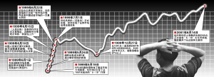 199年的5·19前夕,深滬股市再次探底,上證綜指創(chuàng)出1047.83點的階段新低,許多市場中人都為大盤可能擊穿1000點而憂慮。當(dāng)年5月19日,在沒有任何利好刺激的情況下,在中信國安、廈門信達(dá)等網(wǎng)絡(luò)科技股的帶動下兩市大盤走出放量上漲的行情,并連續(xù)4日大幅上漲,漲幅超過20%,就這樣,一輪井噴式的上漲行情就在投資者毫無準(zhǔn)備下展開了。