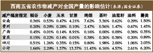 國(guó)金證券預(yù)測(cè),西南五省甘蔗、水稻、烤煙產(chǎn)量在全國(guó)占比分別達(dá)78.19%、21.79%、53%,如果旱情持續(xù),勢(shì)必導(dǎo)致上述農(nóng)作物大幅減產(chǎn)。供求關(guān)系的改變,可能將推高相關(guān)農(nóng)產(chǎn)品價(jià)格。