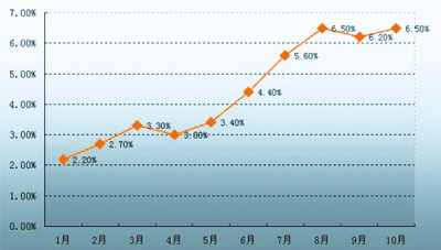 財經(jīng)評論員葉檀認為,央行暫不加息可能來自兩個考量,一是決策層判斷目前國內(nèi)通脹壓力并不大,另一個則是隨后更加變通的匯率政策能夠緩解國內(nèi)的通脹壓力。9月份的CPI上升6.2%,10月份則上升到6.5%,這和8月份CPI增幅創(chuàng)下的逾10年最高點持平。盡管各月的通貨膨脹率有所波動,但大多數(shù)經(jīng)濟學家預計今年全年的通脹率會在4.5%左右。也因為這樣,有學者估計來年央行可能調(diào)高CPI的目標值,將其上調(diào)至4%甚至5%。