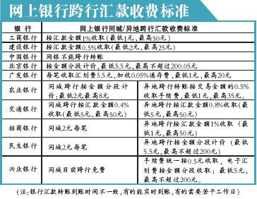 工行規(guī)定,網(wǎng)上銀行跨行轉(zhuǎn)賬收費(fèi)比例是轉(zhuǎn)賬金額的1%,最低1元,最高為50元;招行規(guī)定網(wǎng)銀同城跨行轉(zhuǎn)賬是2元每筆,異地跨行轉(zhuǎn)賬收費(fèi)比例也是1%,最低10元,最高50元。而建行的規(guī)定則是0.5%,最低2元,最高25元。交行則規(guī)定跨行轉(zhuǎn)賬費(fèi)用的比例是0.4%,最低5元,最高是50元。廣發(fā)銀行對(duì)個(gè)人網(wǎng)銀跨行轉(zhuǎn)賬每筆收取匯劃費(fèi)5.5元,加收0.05%的通存費(fèi),最低1元,最高20元。