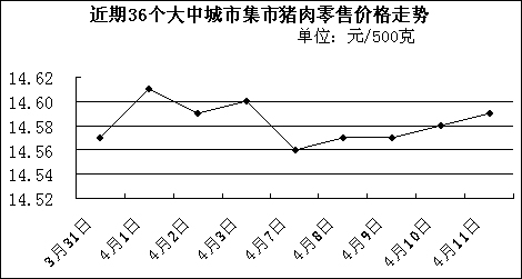 中新網(wǎng)4月14日電 中國國家發(fā)改委網(wǎng)站消息,據(jù)發(fā)改委價格監(jiān)測中心監(jiān)測,上周(4.7-4.11,下同)全國36個大中城市集市豬肉(精瘦肉)平均零售價格每500克為14.57元,比前一周(3.31-4.4,下同)下降0.14%。