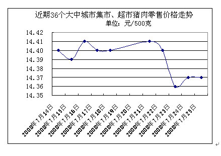 中新網(wǎng)7月28日電 國家發(fā)改委網(wǎng)站消息,據(jù)國家發(fā)展改革委價(jià)格監(jiān)測中心監(jiān)測,上周(2008.7.21-2008.7.25,下同)全國36個(gè)大中城市集市、超市豬肉(精瘦肉)平均零售價(jià)格每500克為14.38元,與前一周(2008.7.14-2008.7.18,下同)相比下降0.13%。