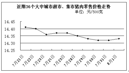 中新網(wǎng)8月4日電 國(guó)家發(fā)改委網(wǎng)站消息稱,據(jù)國(guó)家發(fā)展改革委價(jià)格監(jiān)測(cè)中心監(jiān)測(cè),上周(7月28日-8月1日)全國(guó)36個(gè)大中城市超市、集市豬肉(精瘦肉)平均零售價(jià)格每500克為14.33元,比前一周(7月21日-7月25日,下同)下降0.35%。