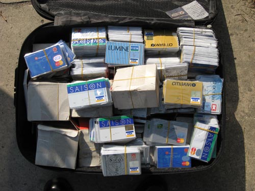 此刻,年輕女子略微猶豫了一下。當(dāng)她抬頭看到民警威嚴(yán)的目光時,只好停住腳步,蹲下身體將拉桿箱的拉鏈打開。就在女青年打開箱子的一瞬間,民警的懷疑更甚。原來里面全是信用卡,卡面上都是外文,而且來自不同的銀行。信用卡被整整齊齊地碼放在箱子中。