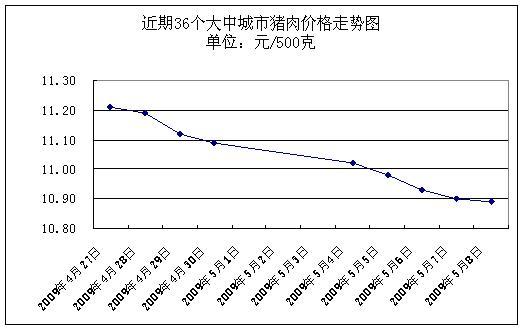 中新網(wǎng)5月11日電 據(jù)國家發(fā)展改革委價(jià)格監(jiān)測中心監(jiān)測,上周(2009.5.4-2009.5.8,下同)36個大中城市集市、超市豬肉(精瘦肉)平均零售價(jià)格每500克為10.94元,與前一周(2009.4.27-2009.4.30,下同)相比下降1.88%。